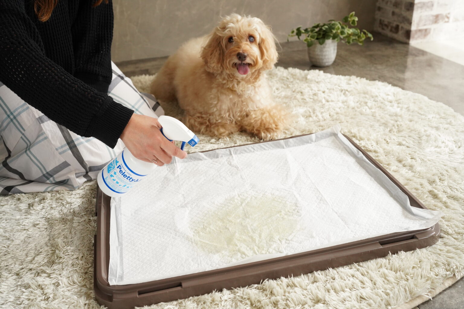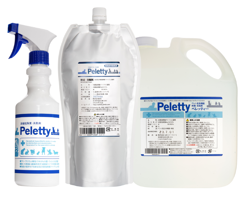 ワンちゃんやネコちゃんのニオイが気になる場所へ直接スプレーします。細菌からウィルスまで99.9%強力除菌され消臭効果も抜群です。スプレーした後をペットが舐めてしまっても悪影響が無いので、自然乾燥でも問題ありませんし、気になる場合は軽く拭き取って下さい。寂しかったり、前のオシッコのニオイが残っているために、つい「おそそう」をしてしまった場合、おそそうを拭き取ってからペレッティーをスプレーしてニオイを除去して下さい。ネコちゃんの盛りの時期のマーキング臭にも有効です。